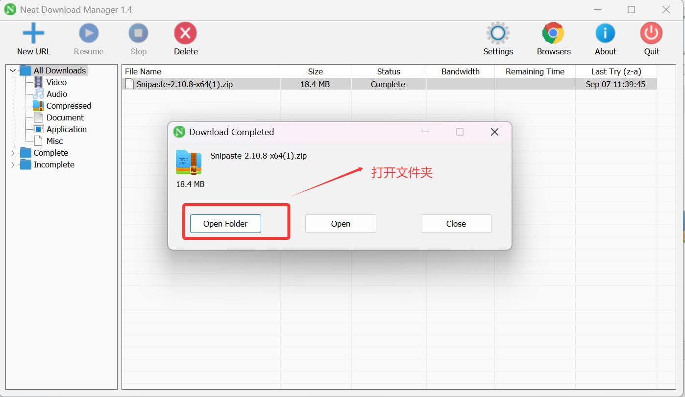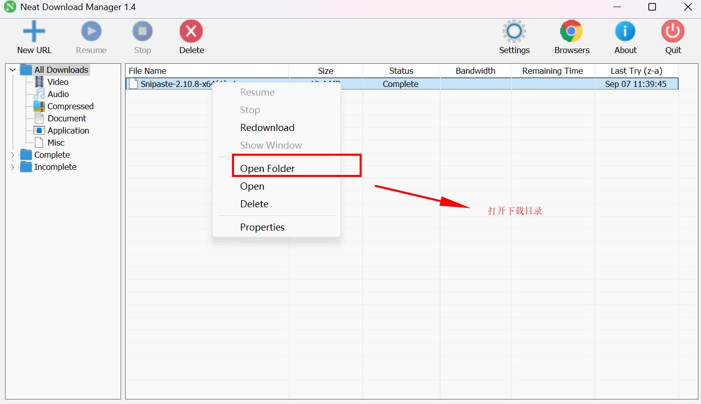 当然,若不小心关闭了提示框,也可右击下载记录选择“Open Folder” 打开: