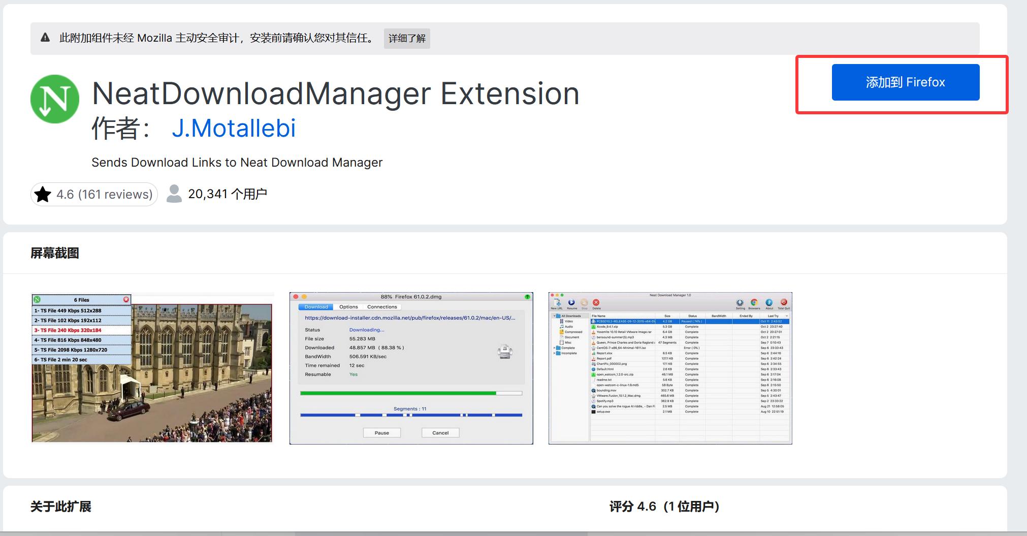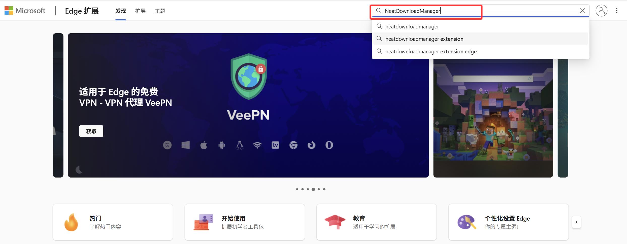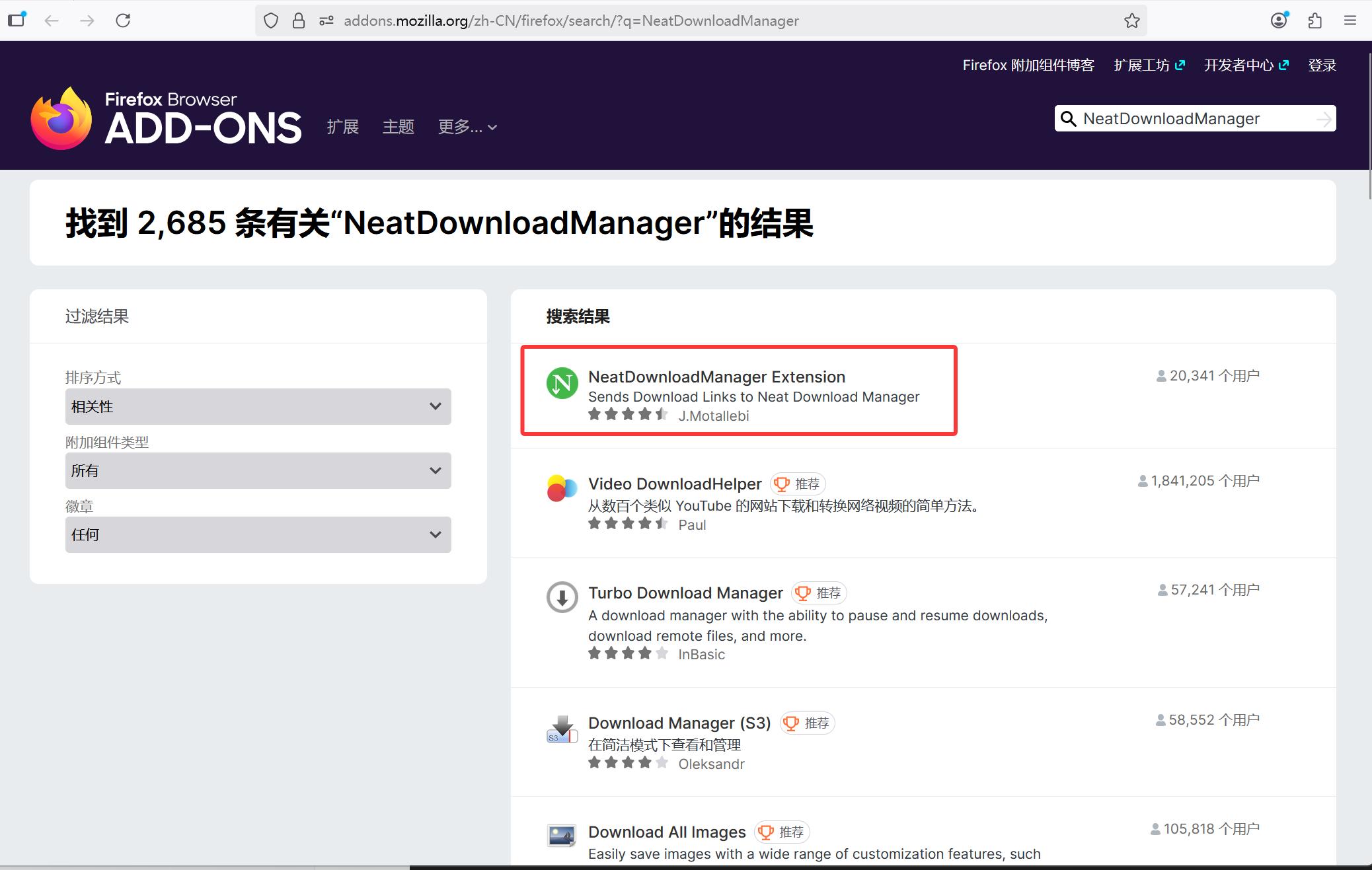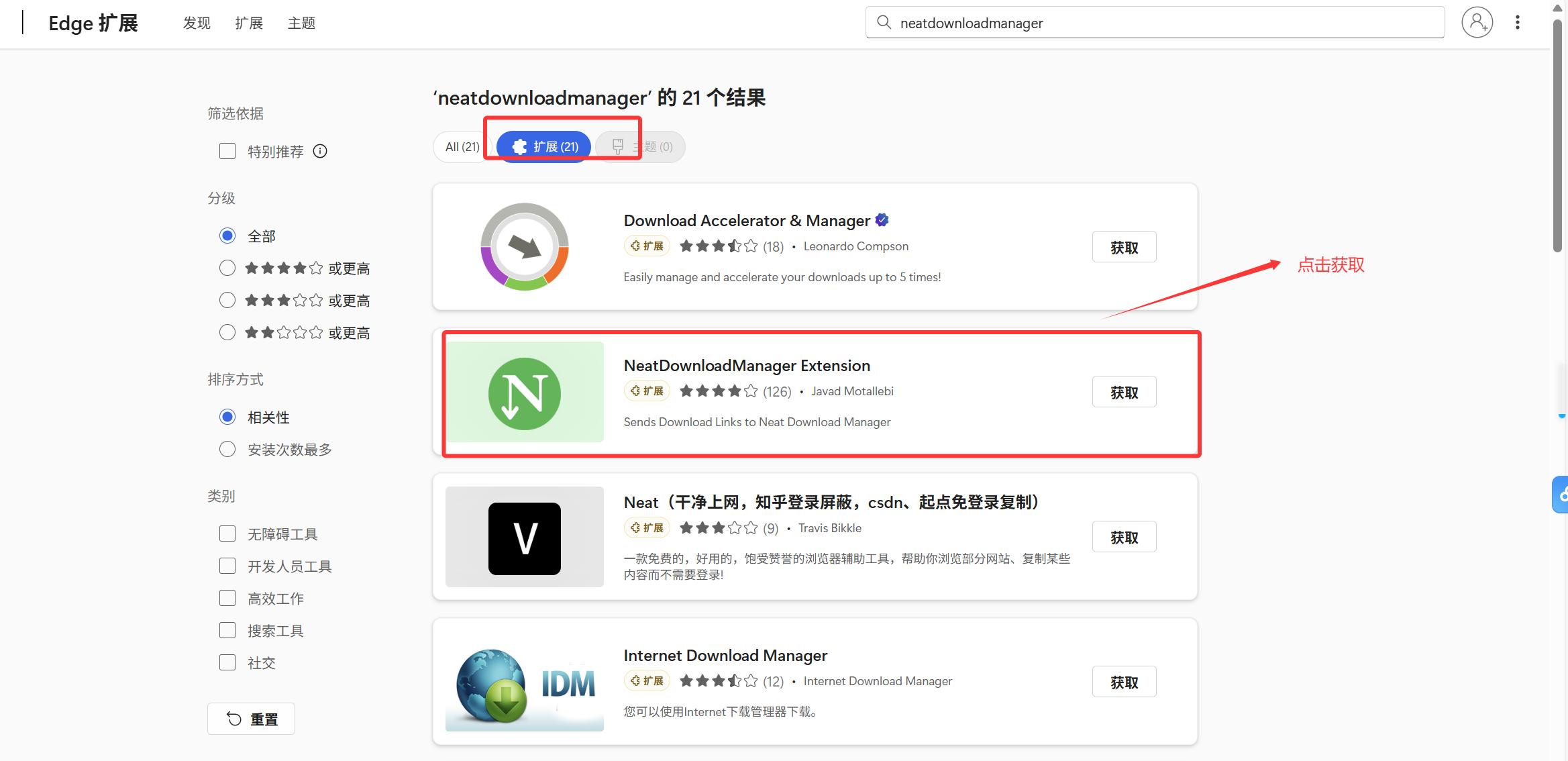 在搜索结果中选择“扩展”,之后仍是选择“Neat Download Extension”,并点击“获取”: