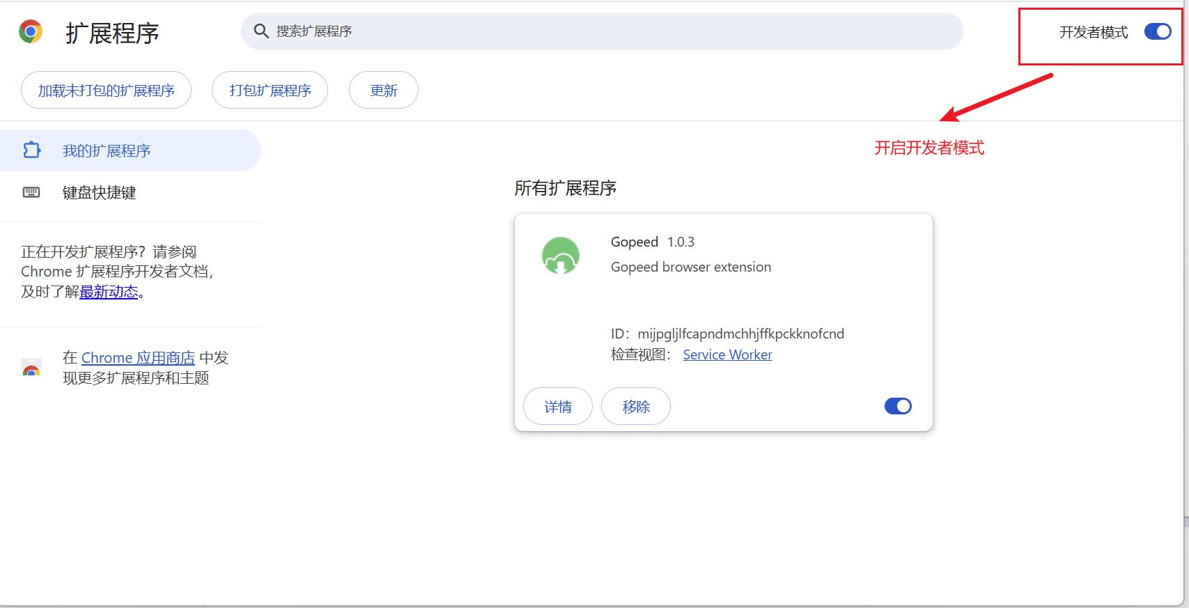 进入管理扩展程序页面后,开启开发者模式: