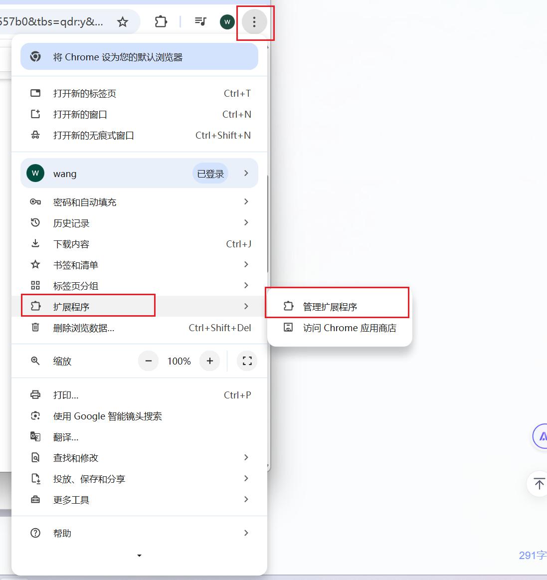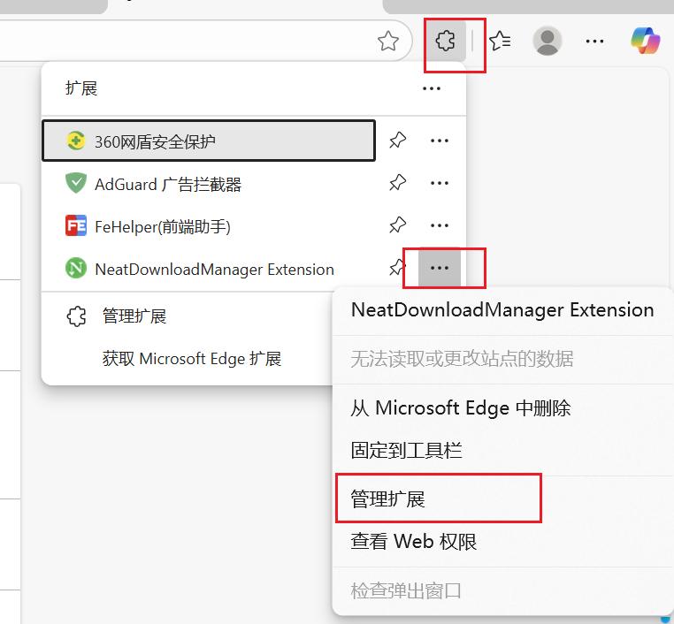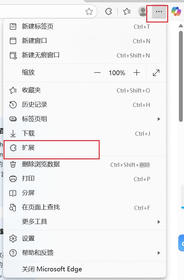 下载安装包后,在浏览器页面点击三个点,选择管理扩展程序: