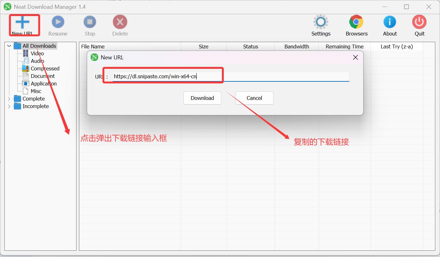接着回到 NDM 界面,选择“New URI”,在弹出的输入框中粘贴复制的下载链接: