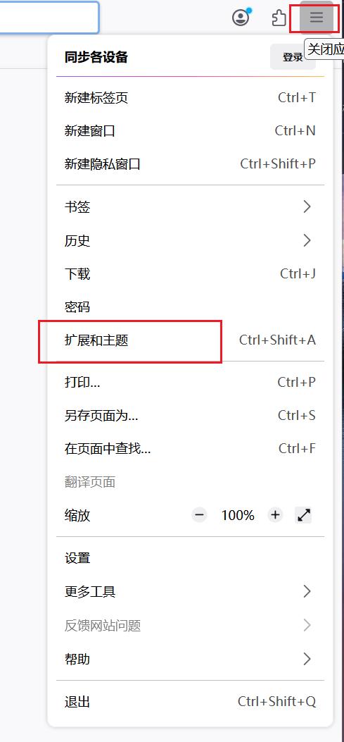 打开火狐浏览器,选择“扩展与主题”: