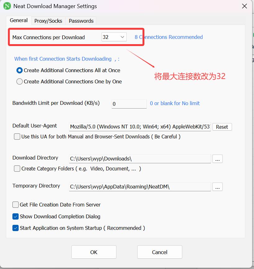 4.1 修改最大连接数选择 “Max Connections per download”,将其由默认的 8 改为最大的32: