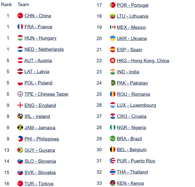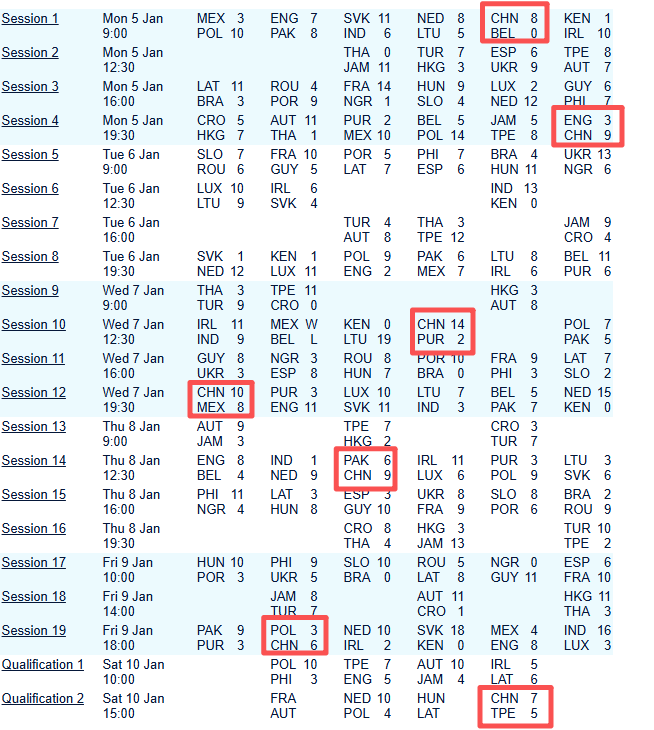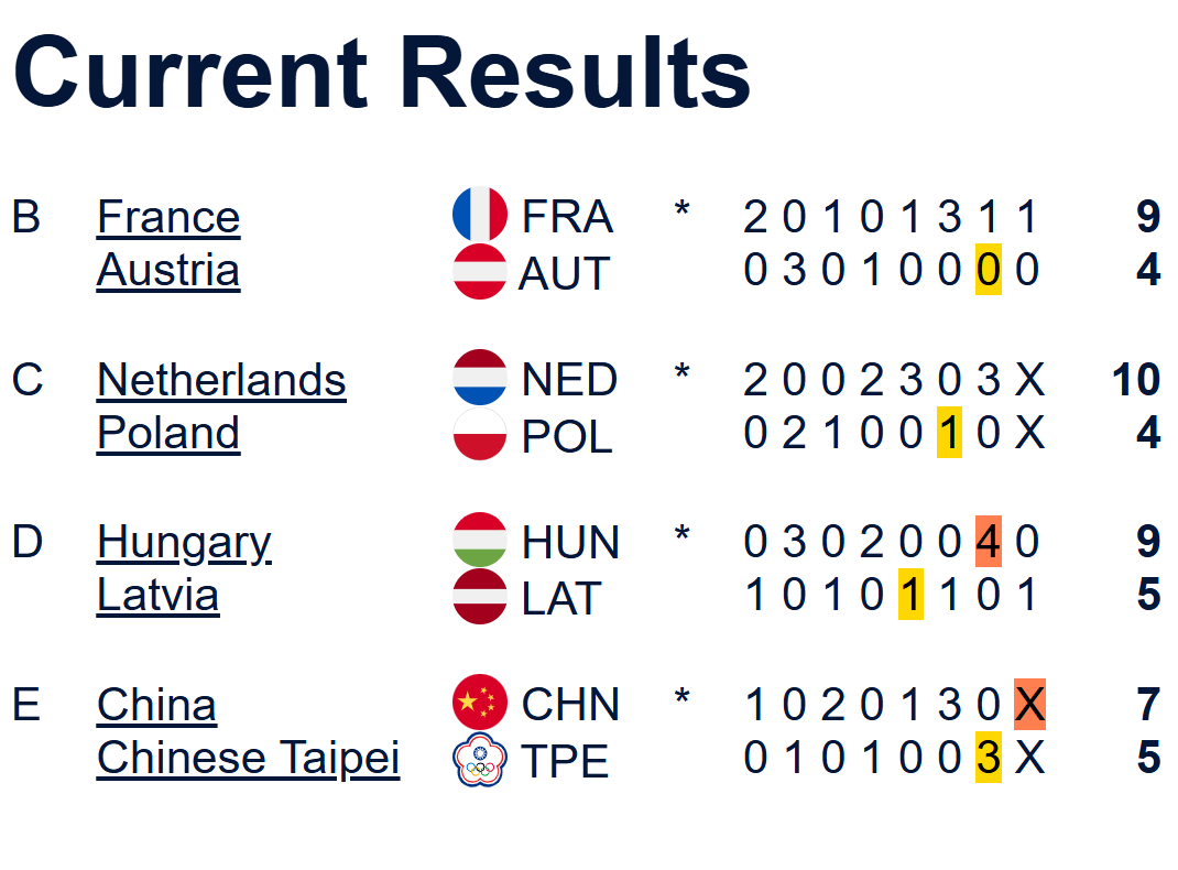 至此,资格赛全部结束,晋级到正赛的球队为中国、荷兰、匈牙利、法国四队。