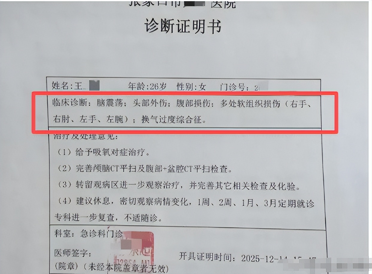 被送往医院后,女子的诊断结果让人心疼:脑震荡、头部挫伤、腹部损伤,还有多处软组织挫伤。