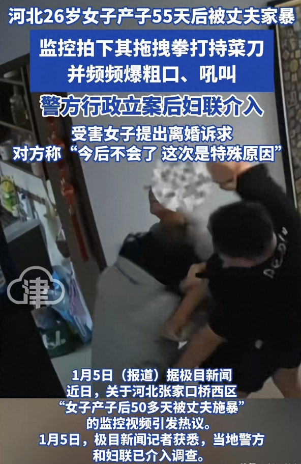 “刚生完孩子 55 天,我被他打得脑震荡,浑身是伤……” 1 月 5 日,河北张家口一名女子的遭遇在社交平台刷屏,让无数网友揪心又愤怒。视频中,刚经历生产、还在恢复期的女子,只因让丈夫帮忙挪动空气净化器,就遭到丈夫疯狂殴打,甚至被对方拿出菜刀威胁。