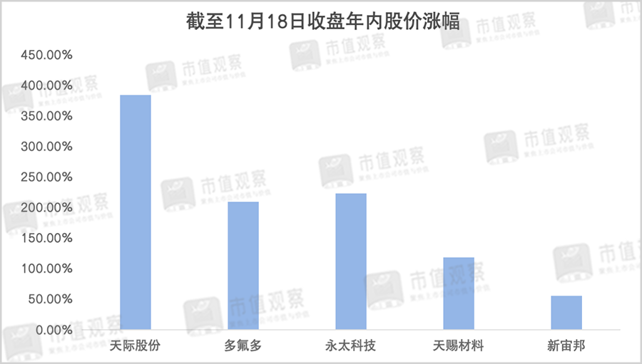 得益于六氟磷酸锂的上涨,今年以来相关上市公司的股价表现也颇为抢眼。就比如天赐材料、多氟多、天际股份、新宙邦和永太科技等,其中天际股份以超380%的涨幅位居首位,新宙邦涨幅最小但也在55%以上。