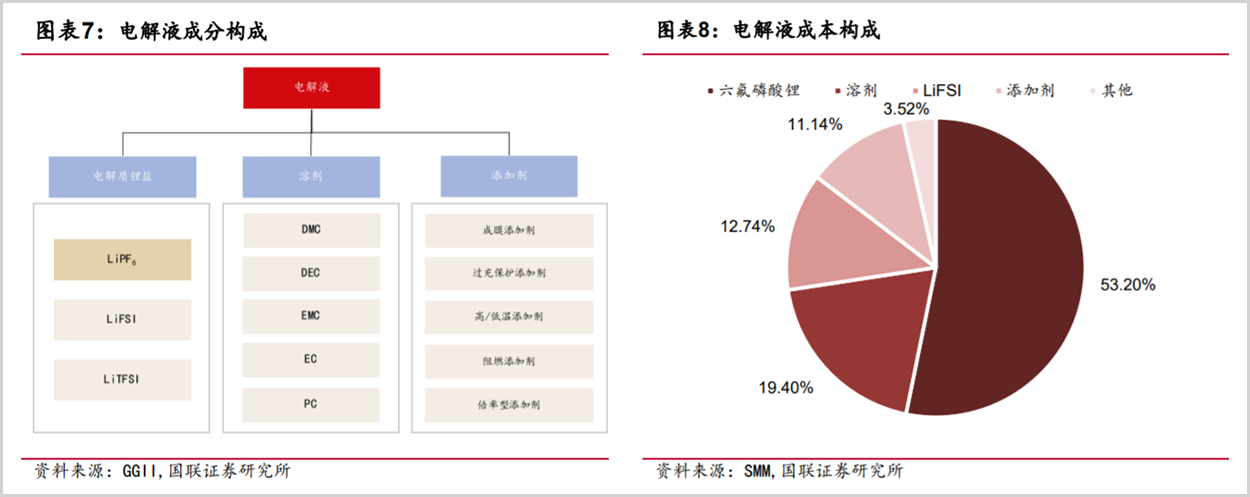 电解液素有“锂电池血液”之称,据国联证券研究,六氟磷酸锂、LiFSI、添加剂和溶剂的成本占比分别为53.2%、12.7%、11.1%和19.4%,其中六氟磷酸锂占比过半。