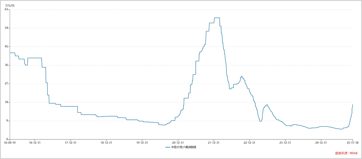 对于六氟磷酸锂未来的价格走势,中信建投研报显示2025年第四季度将进入供需紧平衡状态,这种情况会贯穿2026年,并在第四季度将出现0.7万吨左右的缺口。持续的供需紧平衡为价格上涨提供了基本面支撑,也说明这轮涨价周期依然没有走完,预计站上20万元/吨或只是时间问题。