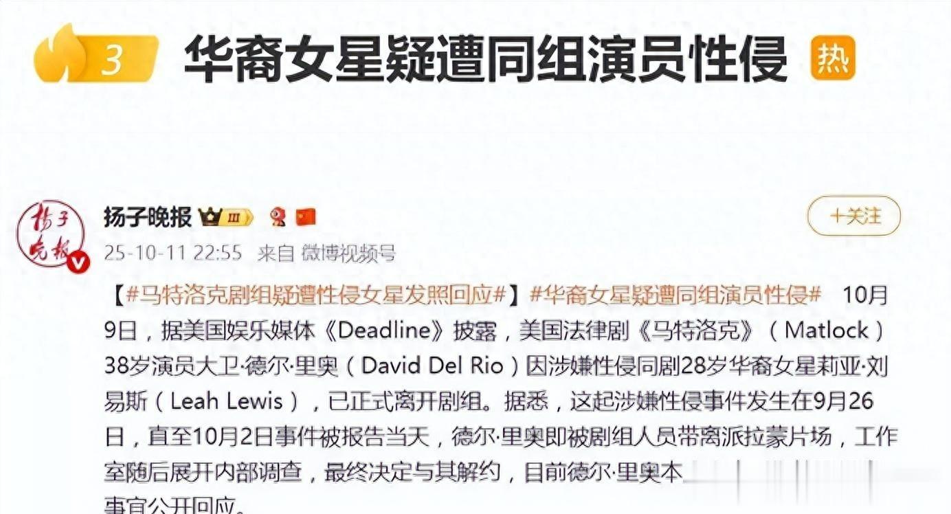 十月二号媒体报道,美国拍法律剧《马特洛克》时出事了。男演员大卫·德尔·里奥被指在九月二十六号性侵同组女演员莉亚·刘易斯。这事发酵好几天了,涉事男演员一直没说话,直到被工作组查实后解约。莉亚随后发了张和妈妈的合影,说自己会勇敢面对。可对方妻子竟然模仿她发相同内容,还@她,这操作把网友气坏了。