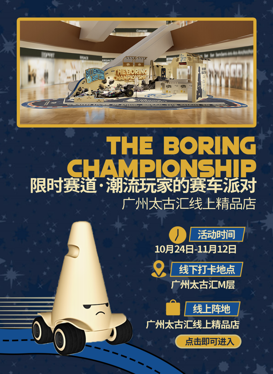 现在正值4周年之际,广州太古汇线上精品店再次打破界限,联手多元潮流品牌THE BORING CONCEPT(TBC),打造一场超燃的「The Boring Championship」赛车派对。