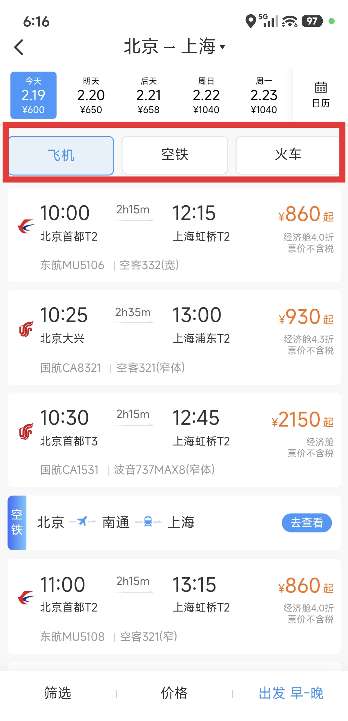 3.进入到空铁联运页面后,可以根据自己的需求选择查询【飞机或者火车】票价了。