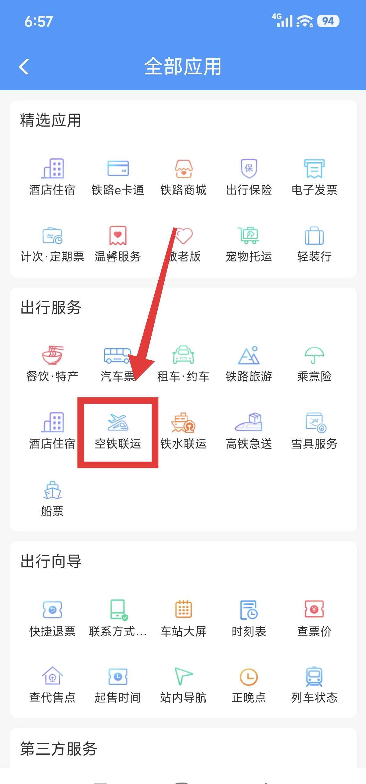 2.进入到全部应用页面后,点击【空铁联运】。