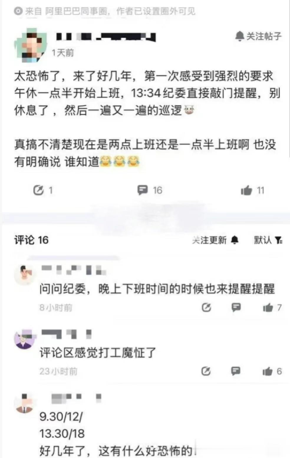 近日有阿里员工在同事圈发帖称,自己午休被纪委 1 点半多直接敲门提醒,然后开始巡逻。该帖子称:“太恐怖了,来了好几年,第一次感受到强烈的要求午休一点半开始上班,13:34 纪委直接敲门提醒,别休息了,然后一遍又一遍的巡逻。