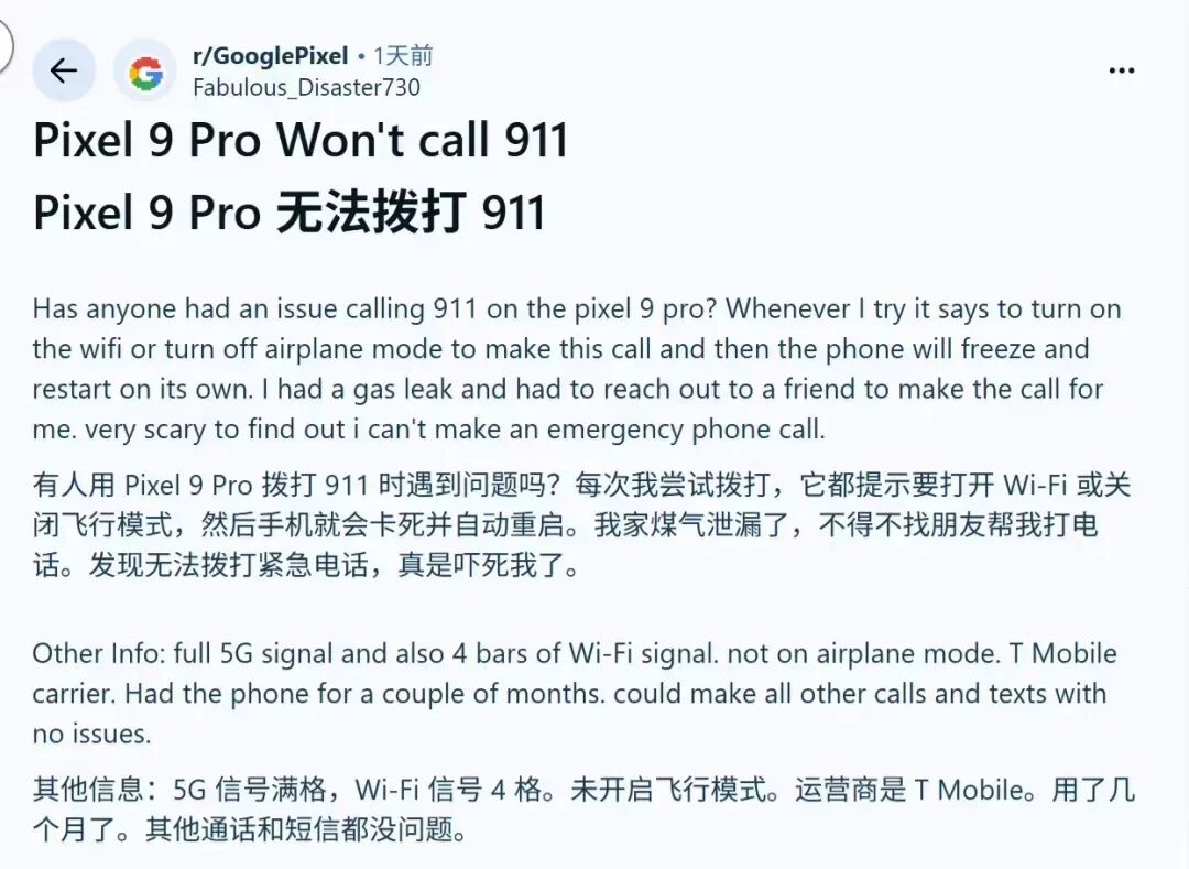 据用户反馈,该问题涉及的机型和运营商范围较广。一名 Pixel 9 Pro 用户称,他在尝试拨打 911 时,手机不仅未能接通,反而直接显示错误信息并自动重启。