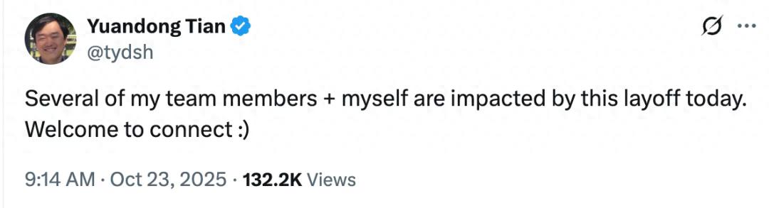 值得注意的是,裁员波及了 华人 AI 大佬、FAIR 研究科学家总监田渊栋,他在社交平台 X 上公开表示自己和团队成员均受到影响。