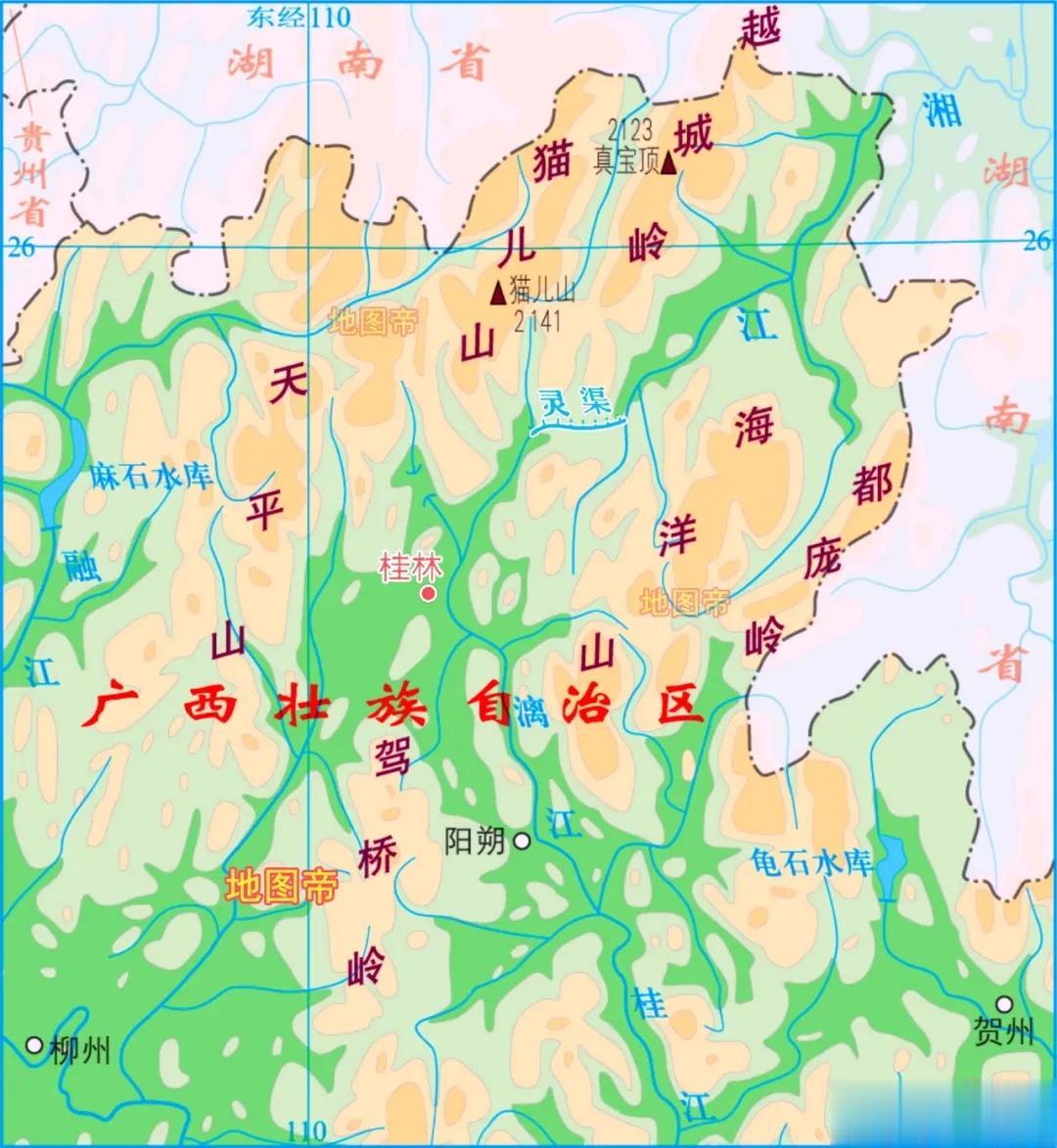 桂林河流有珠江和长江两大水系,漓江-桂江自北向南穿过进入贺州,湘江在其东北部进入湖南永州。