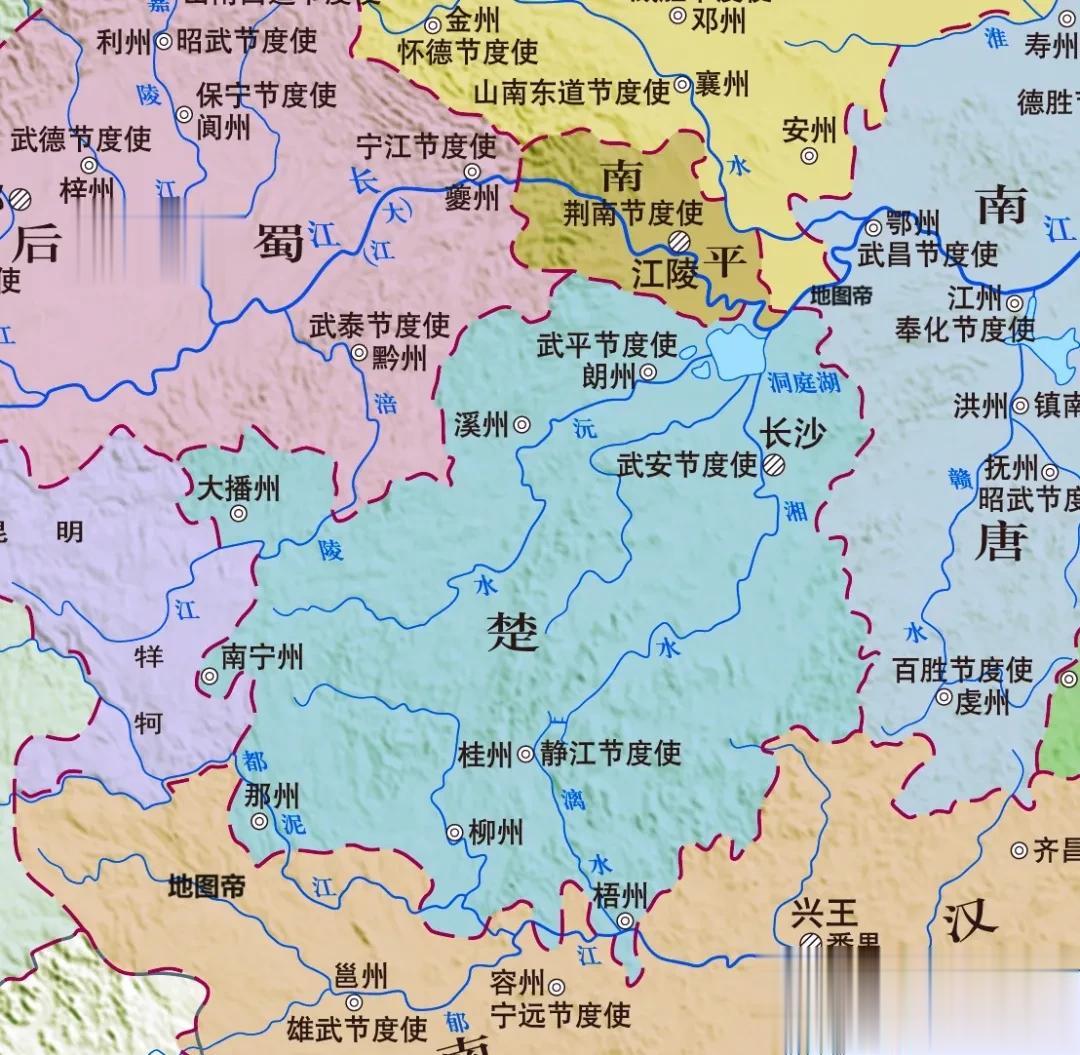 马楚的南面是南汉,两广地区与湖南江西,地理上以南岭(五岭)为界,即越城岭、都庞岭、萌渚岭、骑田岭、大庾岭。五岭当中,马楚越过了西边三岭,广西这一带的桂州、柳州都在马楚版图上。马楚有三个节度使,武安军在国都长沙,武平军在朗州(湖南常德),静江军在桂州(广西桂林)。