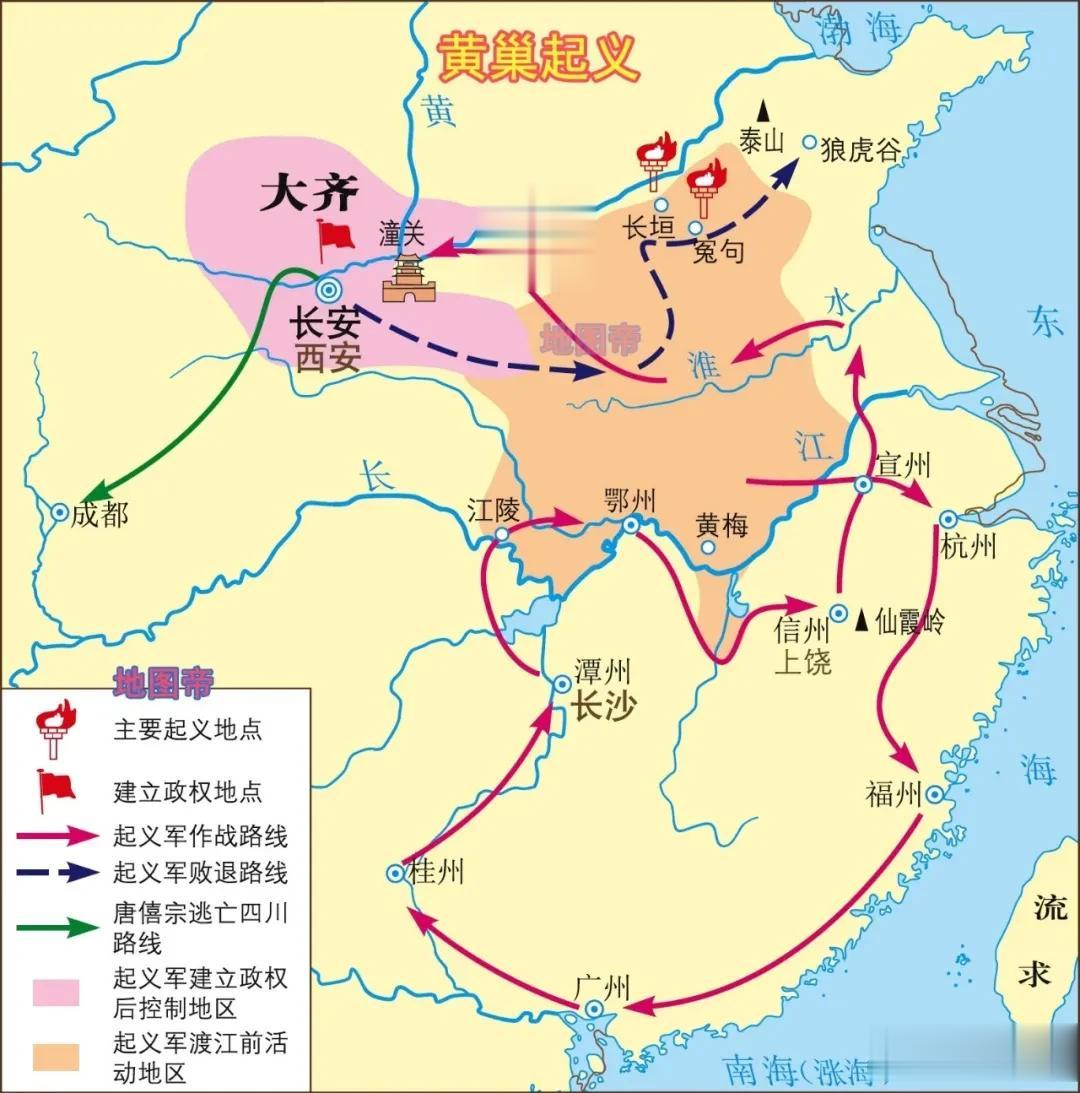 879年(唐僖宗乾符六年)十月,黄巢从桂州(今广西桂林)出发,走灵渠,到湘江流域,乘大筏顺流北上。十月底,攻克潭州(今长沙)。880年 (唐僖宗广明元年、黄巢王霸三年或金统元年)十一月,黄巢进占东都洛阳。十二月,下潼关,进入长安。