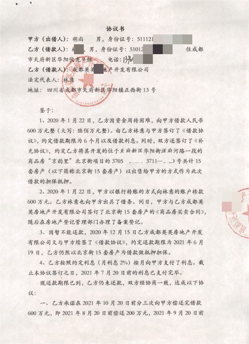 如果说以房抵债群体的遭遇令人震惊,借款抵账债权人的经历则更显荒诞。2020 年 1 月,英英地产法定代表人林某意因资金周转需求,向胡某贤借款 600 万元。双方同步签订 15 套商品房买卖合同并完成网签备案,明确该合同为债权提供担保;借款到期后,房企无力偿还欠款,双方又两次续签协议,再次确认抵押担保关系,约定若到期仍无法还款,胡某贤可处置对应房产。