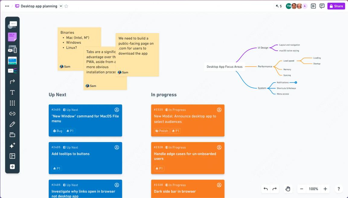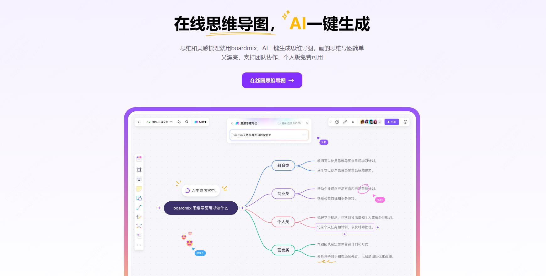 核心优势: 它拥有目前业内最丰富的第三方插件(如 Jira, Zoom, Slack 等),可以将思维导图节点直接转化为看板任务。它的画布流畅度极高,即便同时在线几百人也不会卡顿。AI 功能: 它的 AI 可以自动总结白板上的讨论便签,并将其分类转化为思维导图,效率惊人。推荐人群: 身处全球化大企业、需要进行复杂敏捷开发或大规模创意脑暴的团队。
