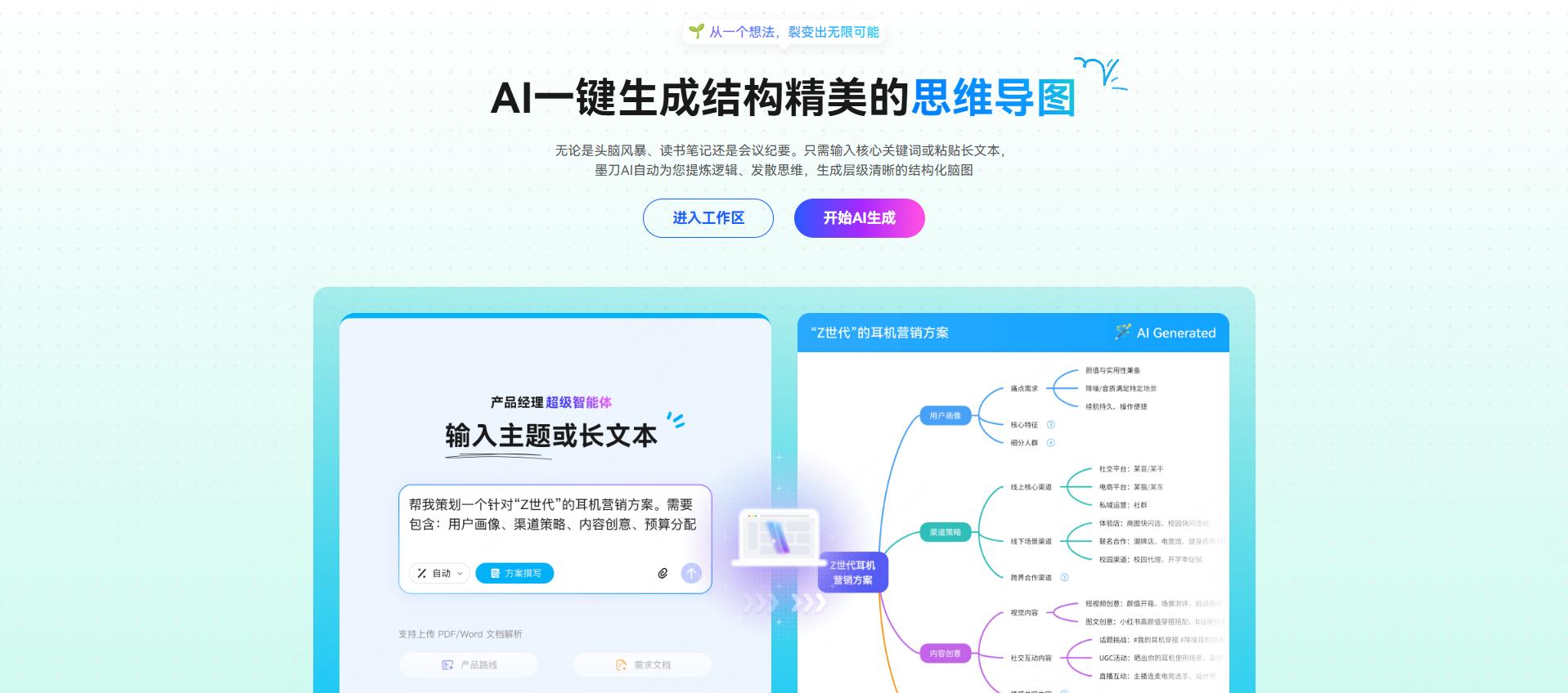 迁移友好: 支持直接导入 MindManager 的 .mmap 格式,老资料可以无缝衔接,且支持多人实时在线编辑。推荐人群: 需要将思维导图与多种资料(图片、文档、看板)进行深度整合的团队。02 墨刀思维导图:从一个想法,裂变出无限可能作为国内知名的原型设计平台,墨刀推出的思维导图功能,主打的是“轻量化”与“逻辑快速梳理”。
