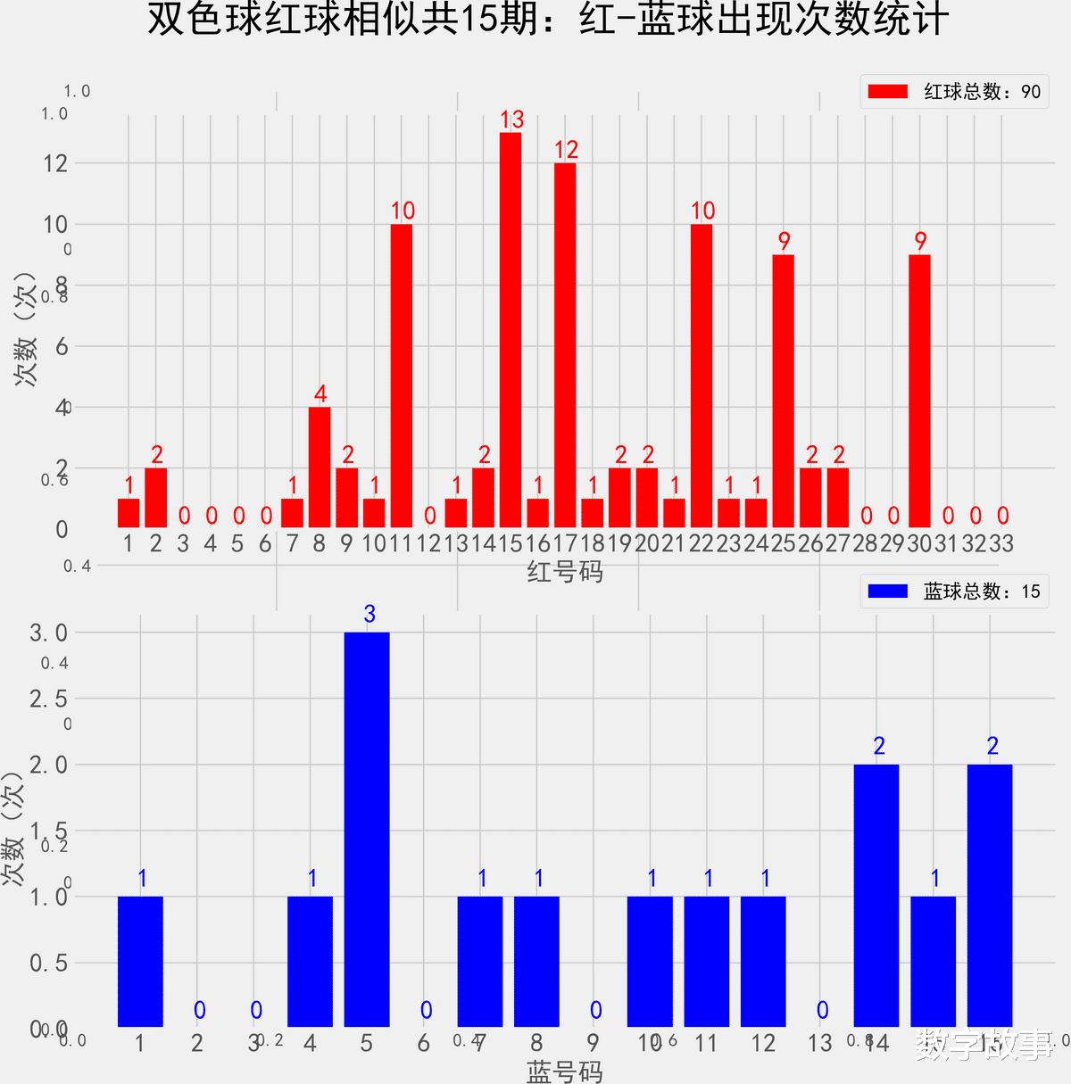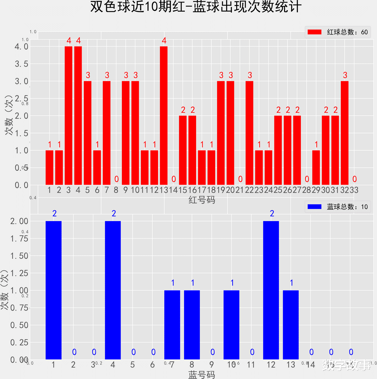 双色球近10期红蓝号统计情况统计样本数据: 60个红球 10个蓝球
