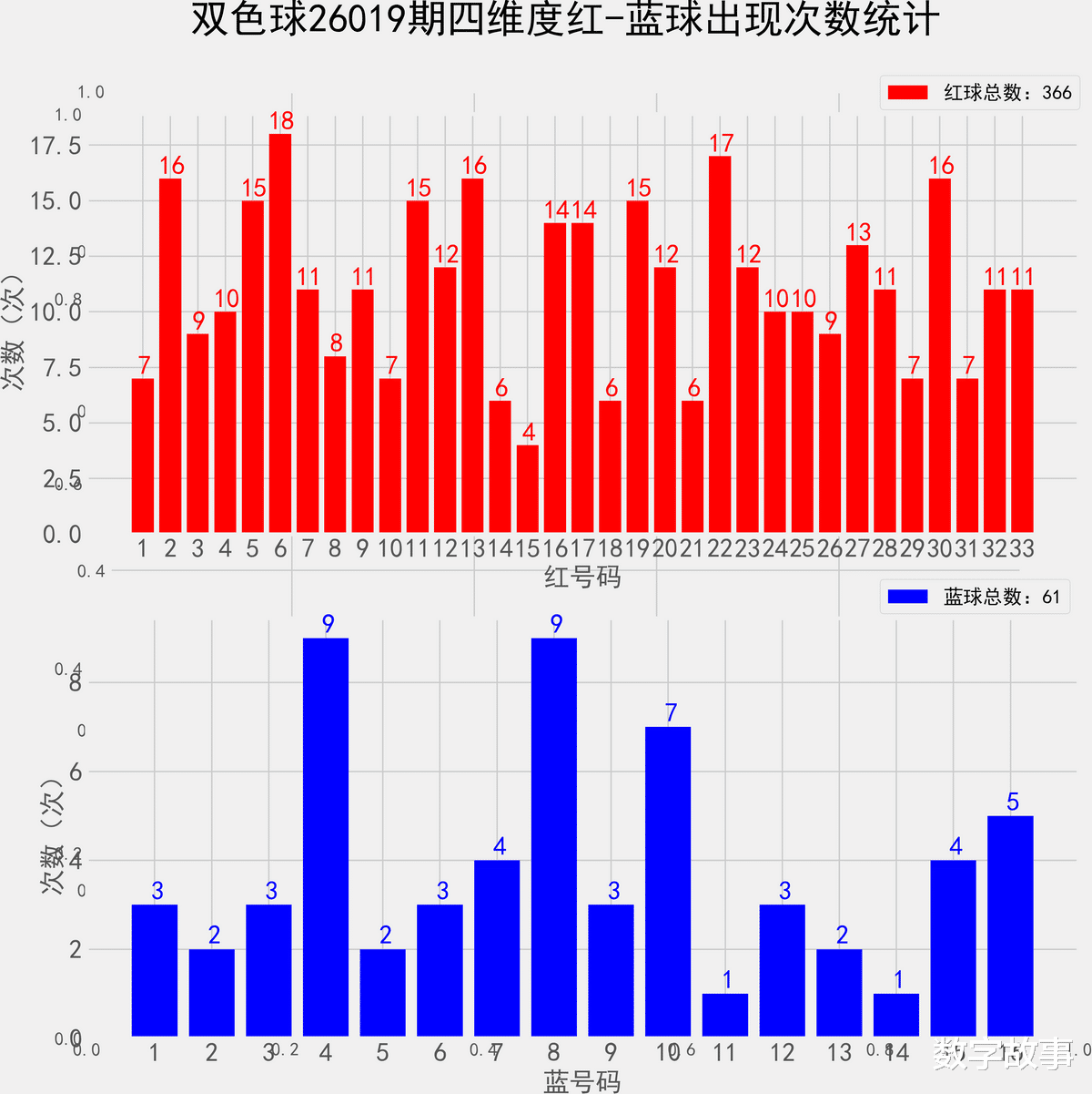 => 统计出现概率综合以上4个纬度的号码, 共61期根据出现的次数,分为热号,冷号,其他的为温号。统计样本数据:366个红球 61个蓝球