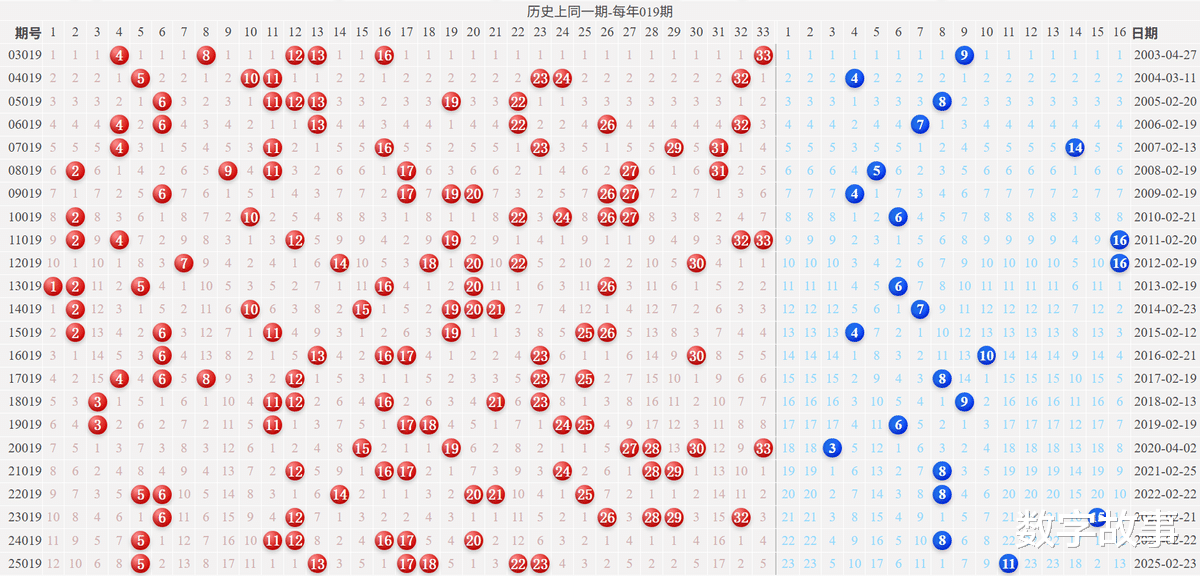 2) 历史同一期: 每年019期 (共23期)