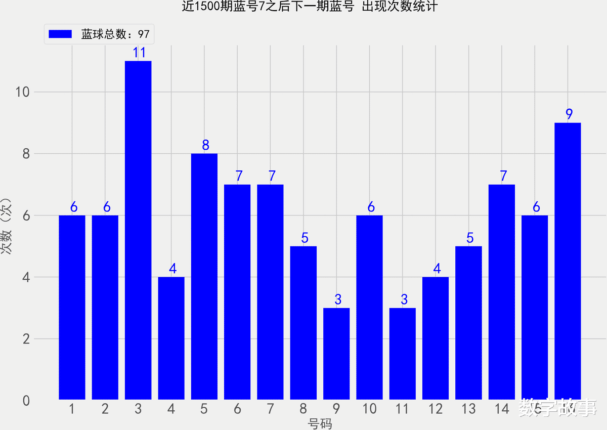 统计近1500期蓝号7之后, 各蓝球的出现次数双色球26018期蓝号是7找出近1500期蓝球7号之后, 下一期出现的所有蓝号,统计其出现次数。,除开这一期,总共出现了97次7号球那么统计的样本数据是97个