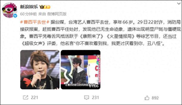 据台媒, 知名 艺人曹西平去世,享年66岁 。