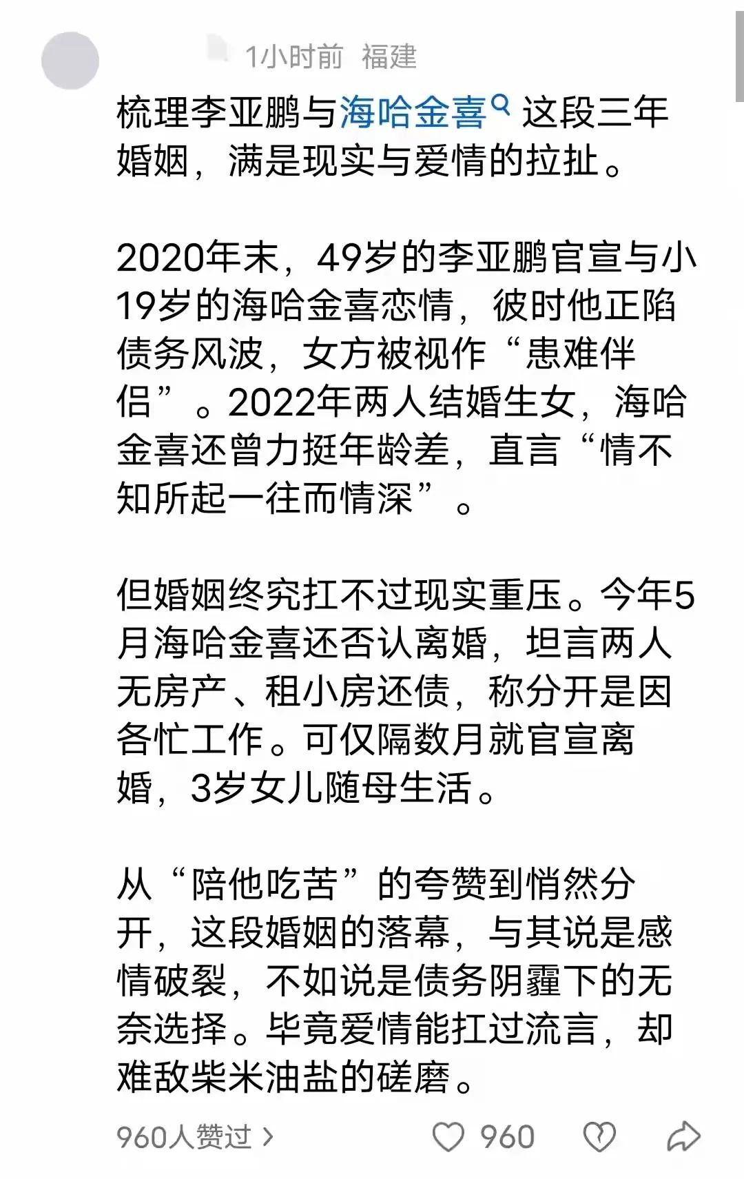 10月14号李亚鹏官宣和海哈金喜离婚,网友评论区炸成“欢乐现场”,刷半小时都不想退出去!