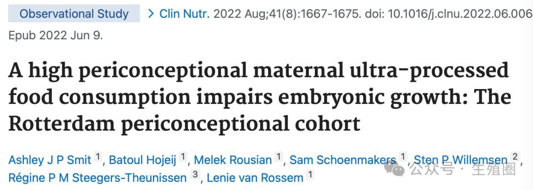 A high periconceptional maternal ultra-processed food consumption impairs embryonic growth: The Rotterdam periconceptional cohort. Clin Nutr. 2022 Aug;41(8):1667-1675. doi: 10.1016/j.clnu.2022.06.006. Epub 2022 Jun 9.