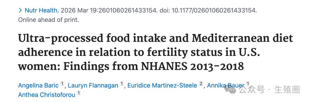 Ultra-processed food intake and Mediterranean diet adherence in relation to fertility status in U.S. women: Findings from NHANES 2013-2018. Nutr Health. 2026 Mar 19:2601060261433154. doi: 10.1177/02601060261433154. Epub ahead of print.