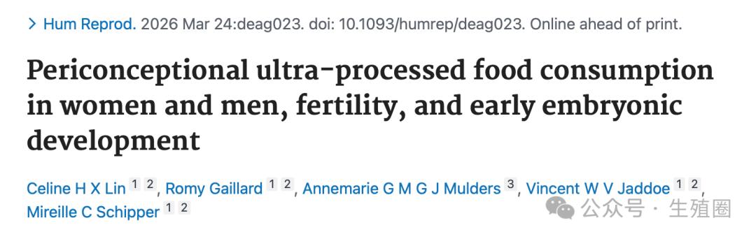 Periconceptional ultra-processed food consumption in women and men, fertility, and early embryonic development. Hum Reprod. 2026 Mar 24:deag023. doi: 10.1093/humrep/deag023. Epub ahead of print.