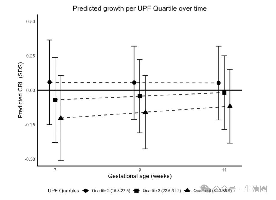 更重要的是,连续数据分析显示,妈妈超加工食品每增加一个标准差单位,孕7周的胚胎就显著偏小0.13个标准差。