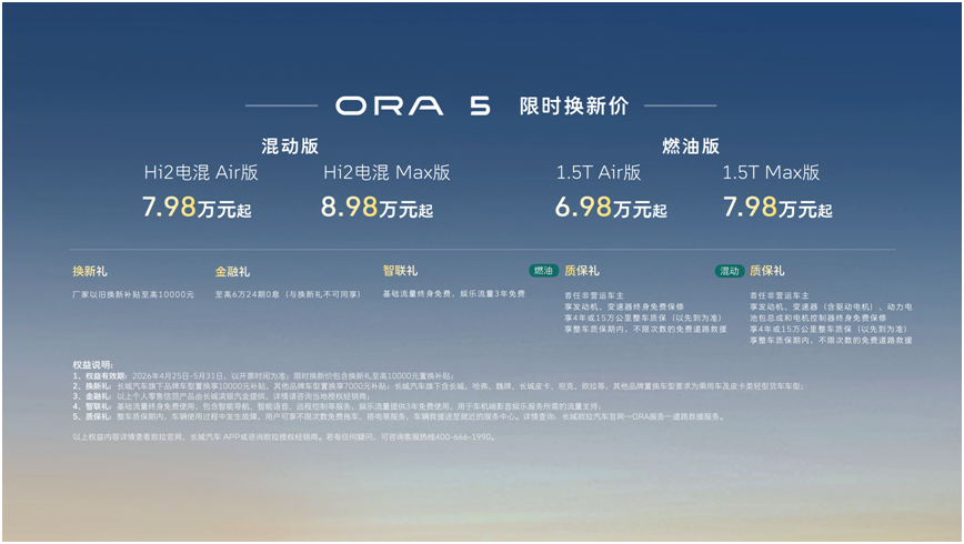 4月25日,长城欧拉在第十九届北京国际汽车展览会举办以“求实”为主题的品牌发布会。长城欧拉5混动版和长城欧拉5燃油版正式上市。其中,欧拉5混动版建议零售价8.98万元起,欧拉5燃油版建议零售价7.98万元起。再叠加上市权益后,欧拉5混动版限时换新价7.98万元起,欧拉5燃油版限时换新价6.98万元起。