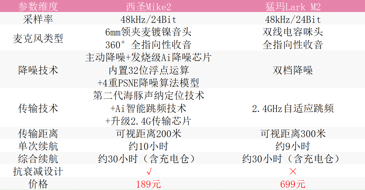 西圣Mike2、猛玛Lark M2哪款值得选?两款产品各有侧重:猛玛Lark M2胜在传输距离远、机身极致轻便,适合对便携性要求高、多场景切换拍摄的入门创作者;西圣Mike2则在收音精度、降噪效果和续航稳定性上表现突出,30小时总续航、成熟的降噪技术,搭配一键降噪等实用功能,能大幅降低后期工作量,单价189元非常便宜,是百元价位中重视音频品质创作者的优选。大家选购时,可结合自身场景的核心需求做决策。