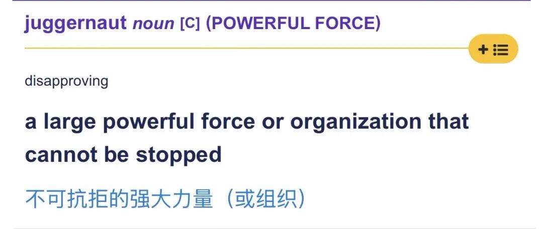 Juggernaut 除了在英式英语中指重型卡车之外,更常用的是它的引申义,相当于 powerful force。