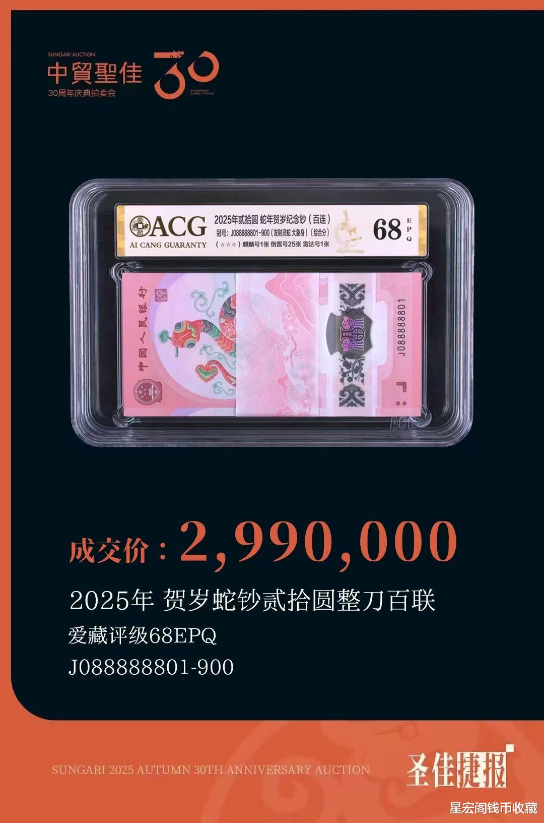 在生肖纪念钞板块当中,其实溢价最高的品种目前也只有2024年龙年纪念钞也是生肖纪念钞系列当中首发品种。而且2024年龙年纪念钞部分靓号品种上涨幅度更大,包括2025年蛇年纪念钞靓号品种就在前段时间,某拍卖会上通天8刀货2026年蛇年纪念钞拍出299万元,这个价格也刷新了生肖系列纪念钞的新高。