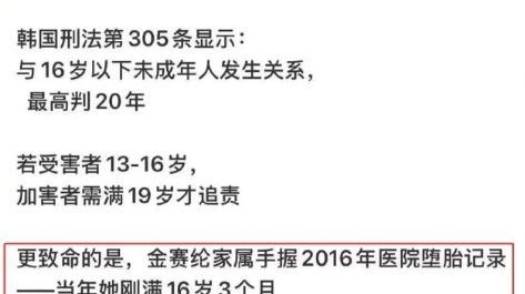 根据韩国法律,与未满16岁的未成年人发生性关系将面临最高20年的有期徒刑。