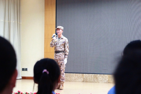 “九三阅兵”优秀战士胡阿龙进行国防知识宣讲。