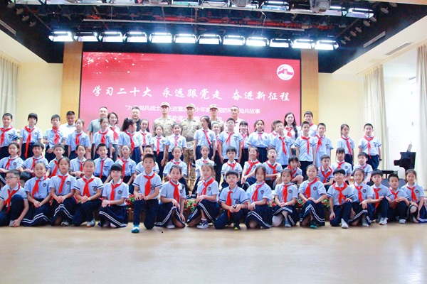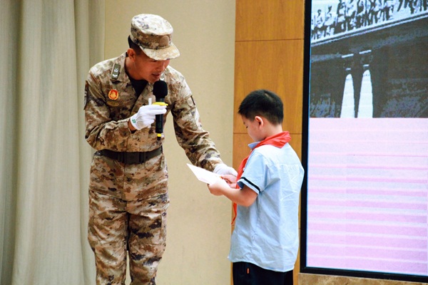 活动中,学生代表以激昂朗诵诉说对祖国的热爱、对军人的崇敬,传递新时代青少年传承抗战精神、勇担时代使命的决心。活动尾声,珊瑚实验小学为胡阿龙、栾忠坤、陈小龙三位战士颁发“国防知识思政课校外辅导员”聘书,邀请他们持续为青少年国防教育助力;同时向学生代表授予“思政课·国防教育研学实践活动”旗帜,标志着校园国防教育实践的进一步延伸。