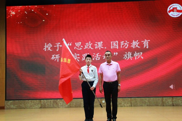 授予“思政课·国防教育研学实践活动”旗帜现场。