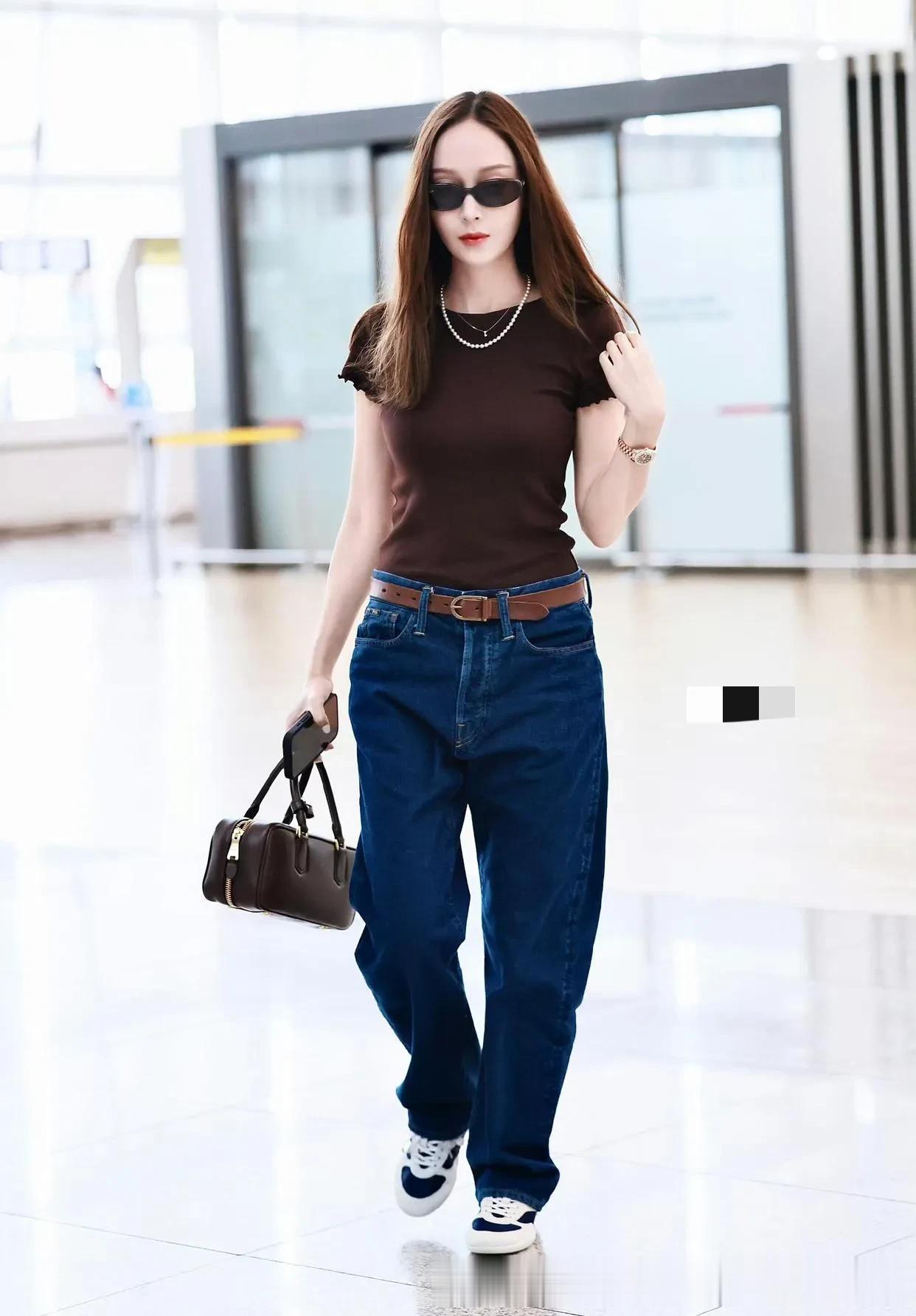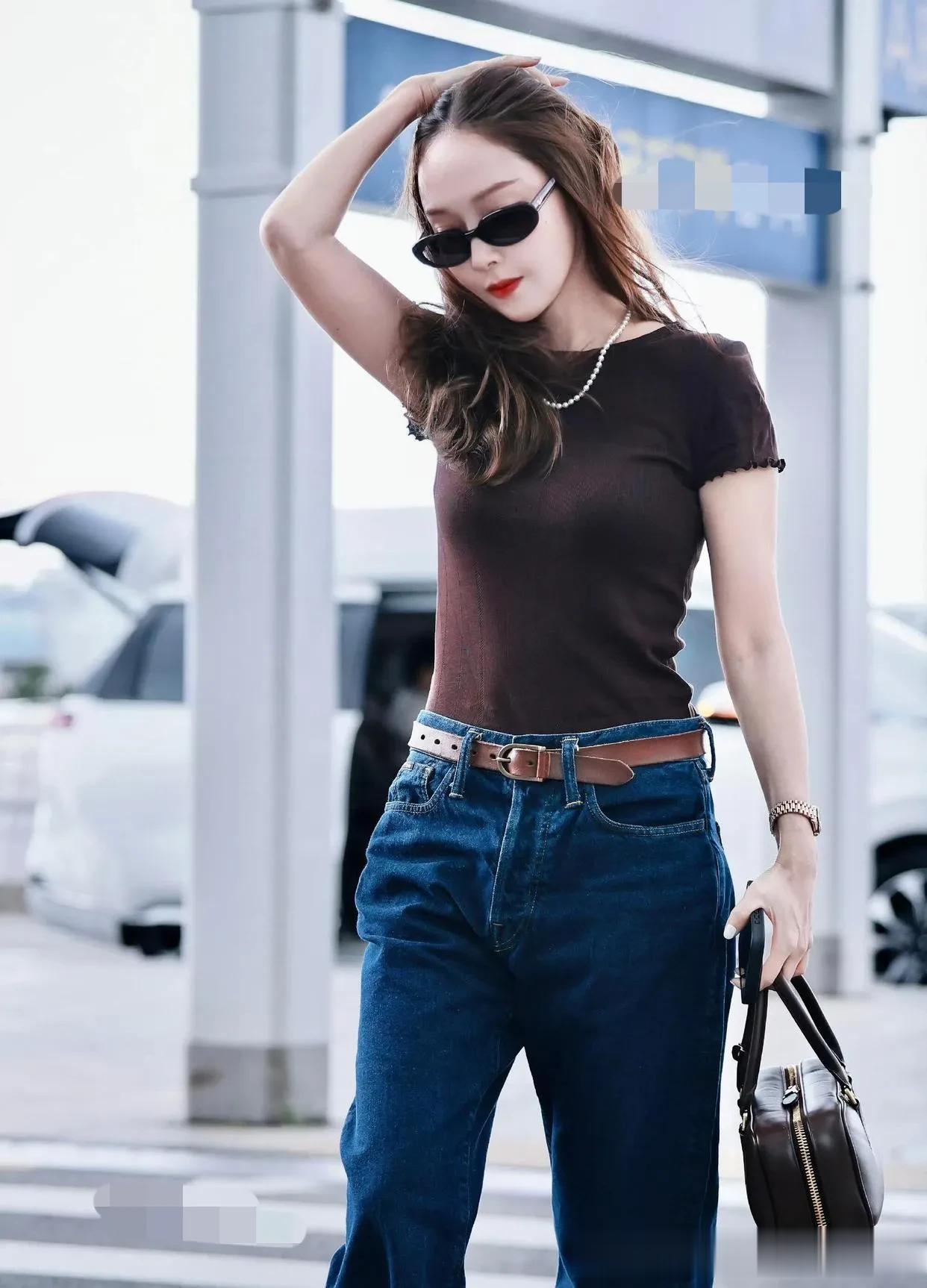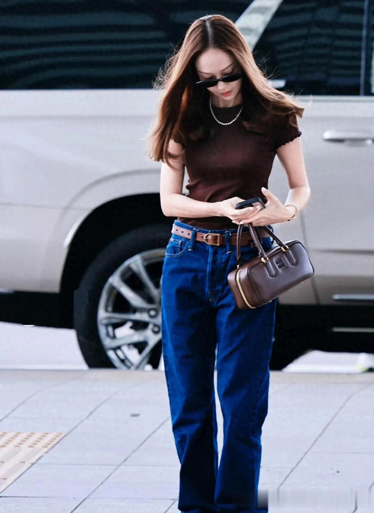 郑秀妍机场私服真会穿!棕色短袖+牛仔裤,时髦又高级!