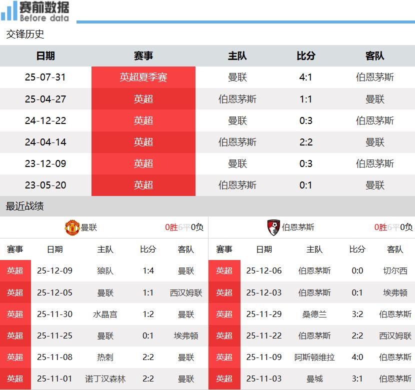 第一:两队情况!英超前15轮战罢,曼联7胜4平4负积25分排名第八,伯恩茅斯5胜5平5负积20分排名第十五。上轮英超,曼联客场4-1大胜狼队,近3轮联赛2胜1平保持不败;伯恩茅斯主场0-0闷平切尔西,遭遇联赛6轮不胜(2平4负),状态低迷。