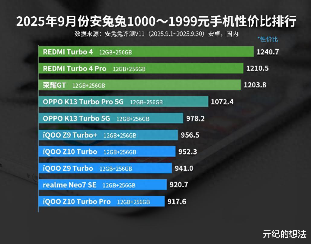 对于2025年9月安兔兔千元机性价比榜单,亓纪的想法是这样的:预算在1400元左右,搭载天玑8400的红米Turbo4是一个不错的选择,如果对续航有更高的需求,可以看看隔壁的iQOO Z10Turbo。如果你对性能有更高的需求,第四代骁龙8s芯片了解一下,对应的机型是红米Turbo4 Pro、iQOO Z10 Turbo和OPPO K13Turbo Pro,三款机型的售价都在1600元左右。