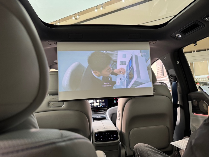 投影可以说是问界M9相比理想L9最大的差异化功能了。由于显示的面积更大,视觉效果确实会更震撼。不过也有很多问题,首先就是投影的体积实在是太大了,要将投影布放下来,需要前排座椅往前调,然后就是投影仪的位置,会让人顶到头,虽然不会有人坐在那里,但乘客进出的时候,多少都有点碍事,最后就是操控,没有提供遥控和手势控制,而是选择了语音控制,操作起来不够便利。所以,问界M9的投影虽然视觉效果更好,但只能在停车休息的时候使用,驾驶途中不仅操作不方便,看起来也很费劲,特别是第二排乘客,离眼睛太近了,反而有种不适感;相比之下,理想L9的吸顶电视虽然显示面积小,但行车的时候也能用,操作方式也更加方便。