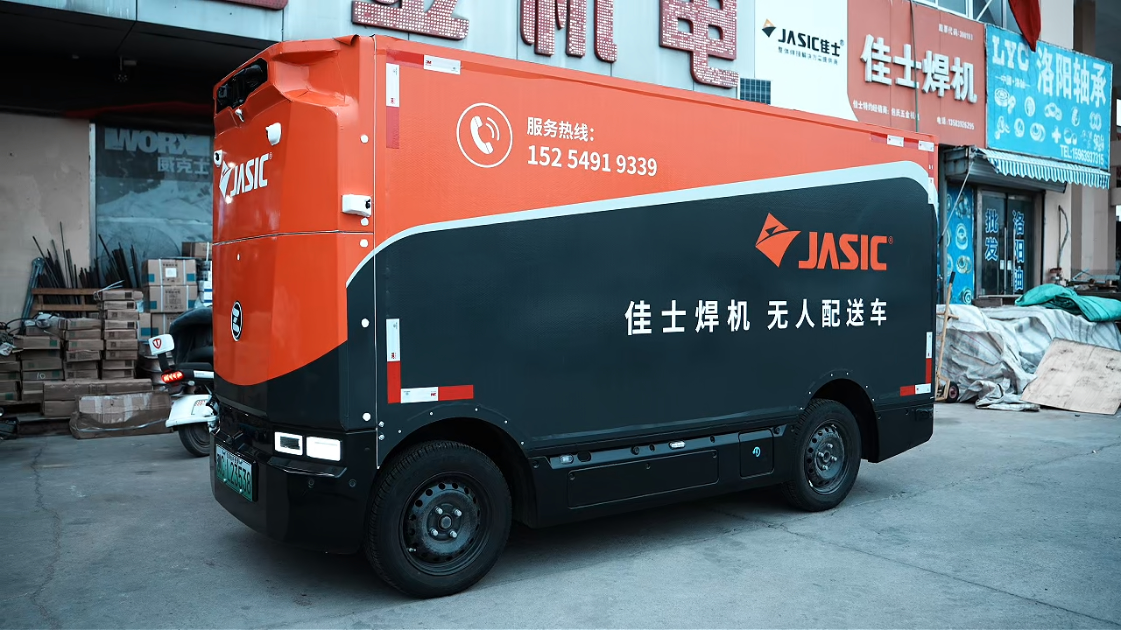 佳士有个经销商老周,弄了几台无人配送车,样子跟快递那种小车差不多。外观是经典的佳士橙,里面焊了个货架,调了路径,让它能在各个园区里送焊机、焊配和焊材。