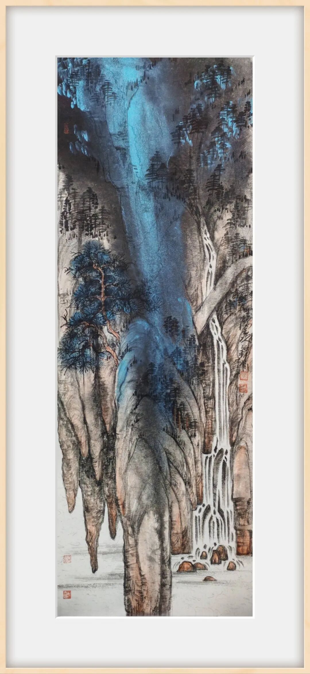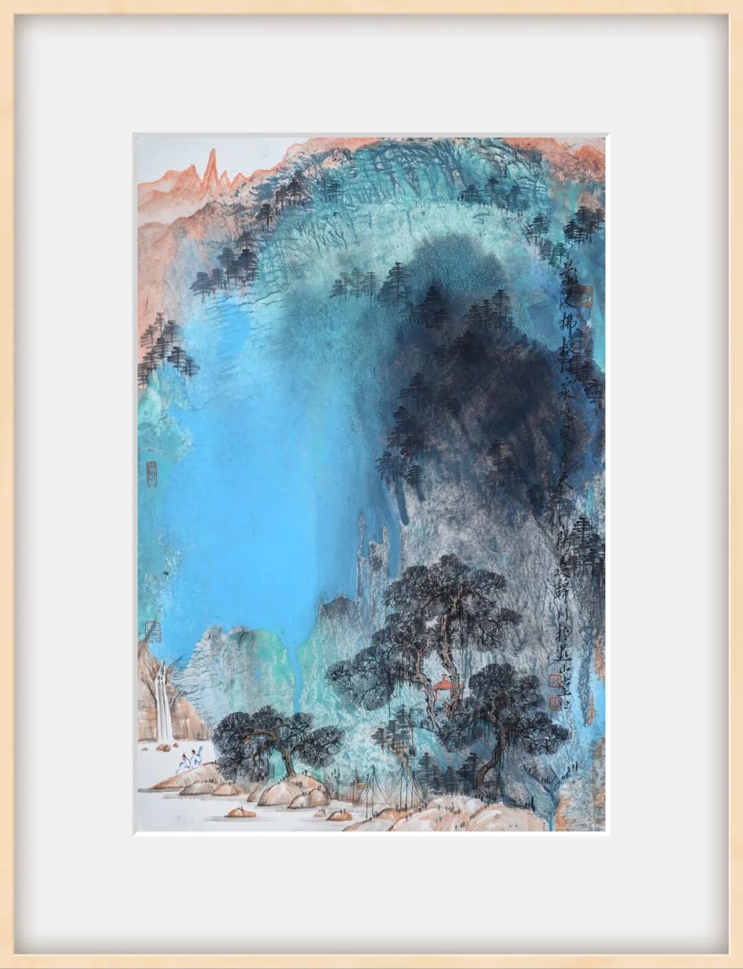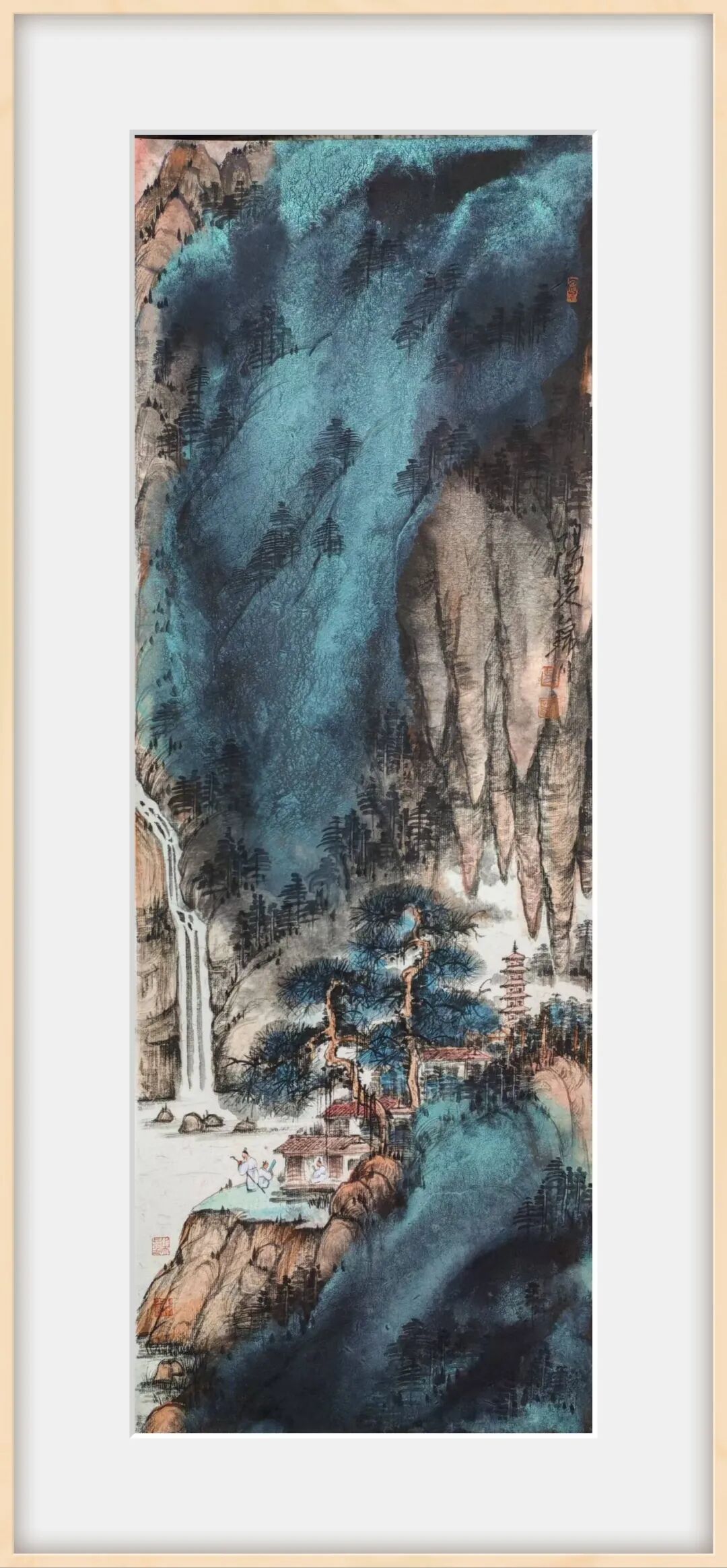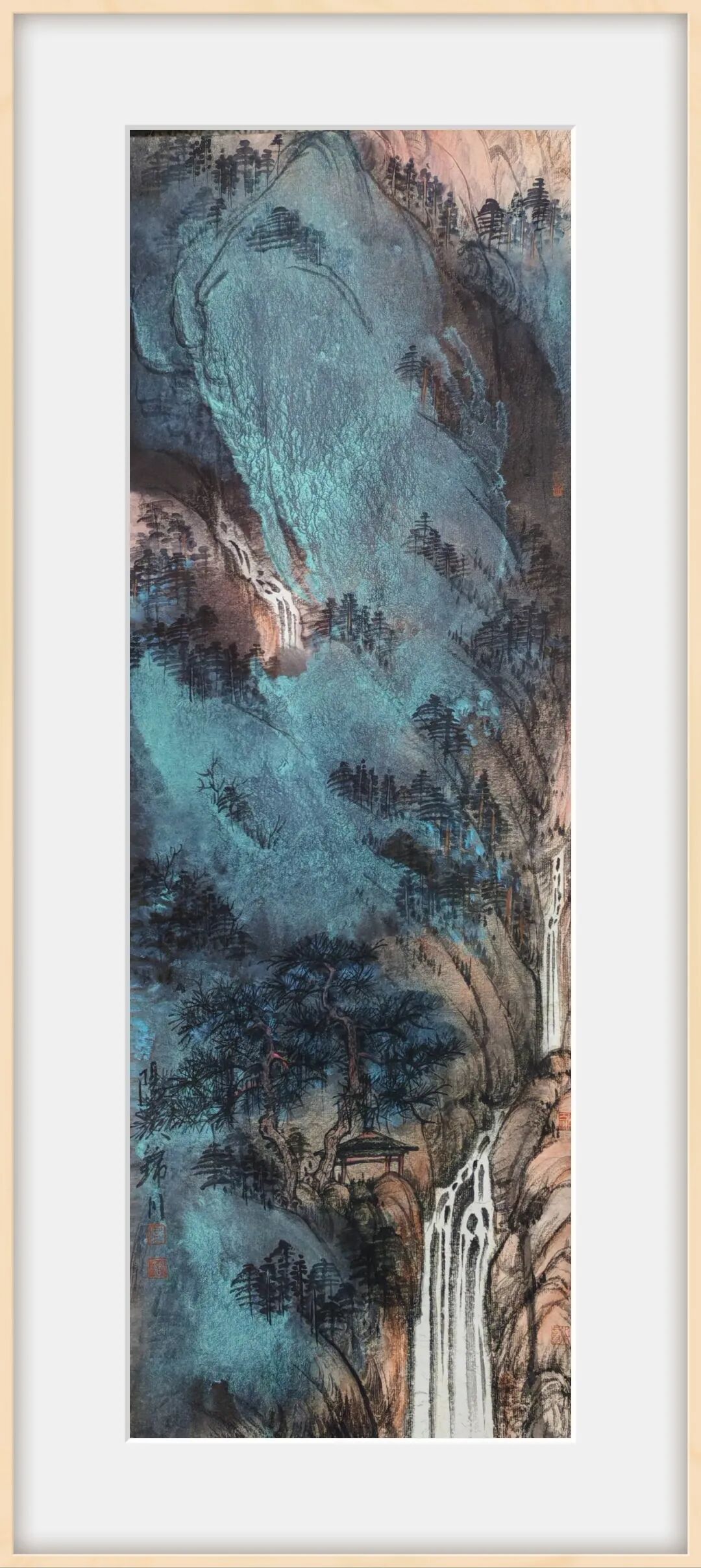 一、图式的现代性突破:从具象再现到抽象表现的跨越。吴锦川的泼彩山水打破了传统文人画“以墨为主、以色为辅”的笔墨框架,开创了以色彩为主导的新图式。视觉结构的重构:通过“破墨泼彩”技法。先以清水或淡墨铺底,再泼洒浓墨重彩进行“破”与“泼”的互动,形成半抽象的色块结构 。这种图式弱化了线条勾勒,强化了色墨渗化所产生的自然肌理与空间呼吸感。色彩的解放与主导地位:石青、石绿、朱砂等矿物颜料被大胆泼洒,使色彩从传统的填充角色跃升为独立的审美主体,形成冷暖对比强烈、流动趋势明显的视觉交响。空间的流动性表达:画面常以留白制造空间深度,如瀑布处的撞粉与天光留白形成虚实相生的效果,营造出山雨欲来、云气弥漫的动态空间感。